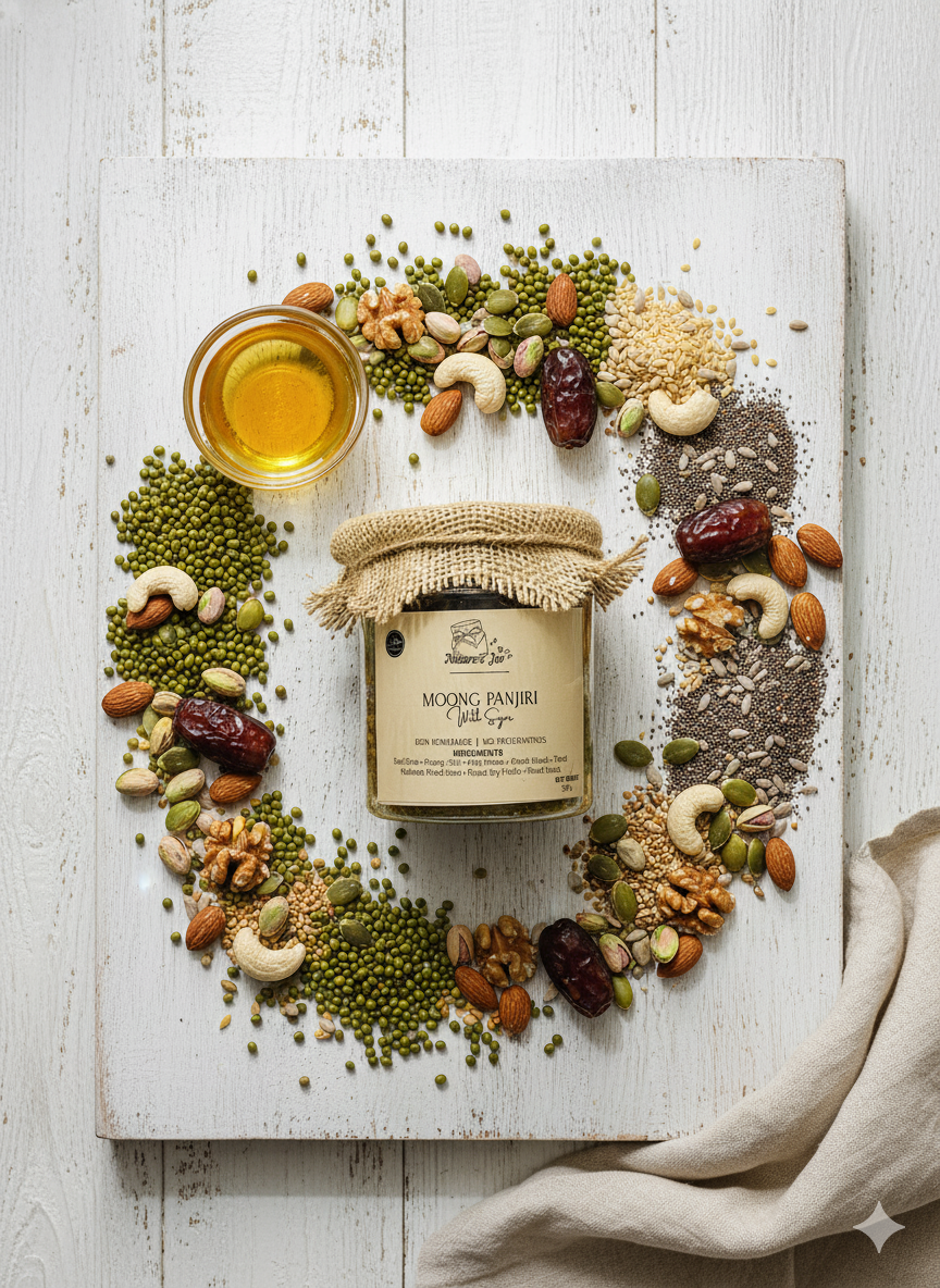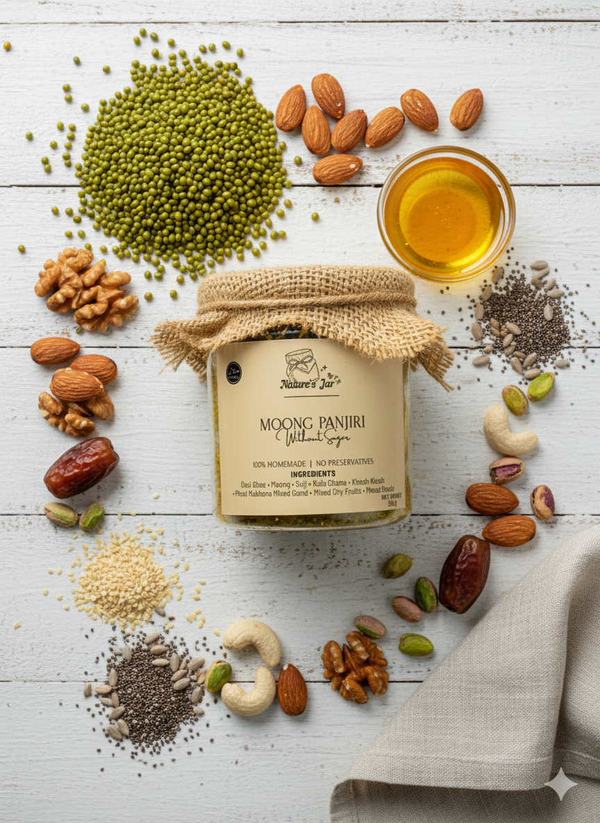 Diet Moong Panjiri (Sweetened with Dates): Sweetened naturally with dates for balanced, natural sweetness — offering the same taste and nutrition without refined sugar, ideal for fitness-conscious and diabetic-friendly diets.