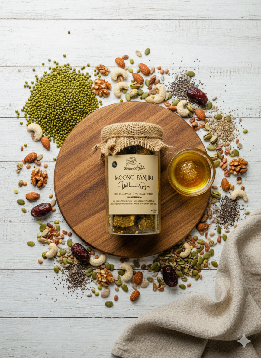 Crafted with care in small batches, Moong Panjiri offers the perfect balance of traditional comfort and modern wellness. Whether you choose the Classic or Natural Date-Sweetened version, each bite delivers pure desi warmth, strength, and satisfaction — the perfect everyday treat for health and happiness.